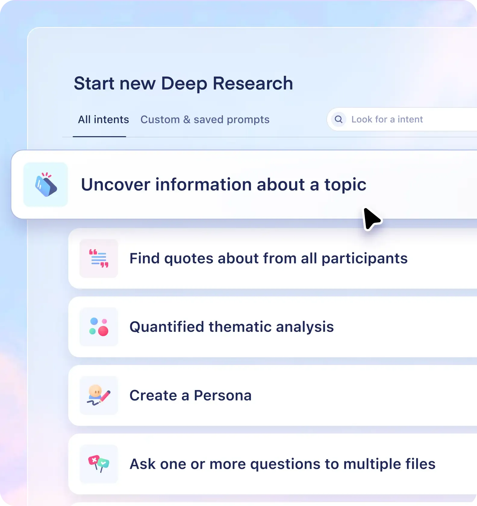 Deep Research works directly with your raw transcripts, surveys, and files, saving you hundreds of hours with tag-free, automated insights.