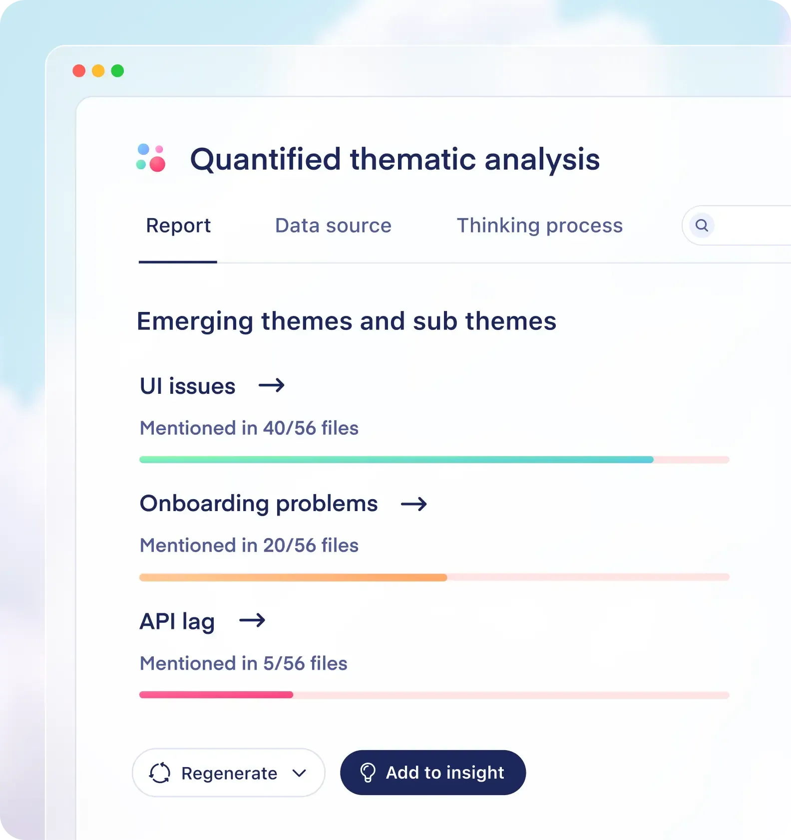 Every insight is linked directly back to the source data and quotes it came from. No black boxes.