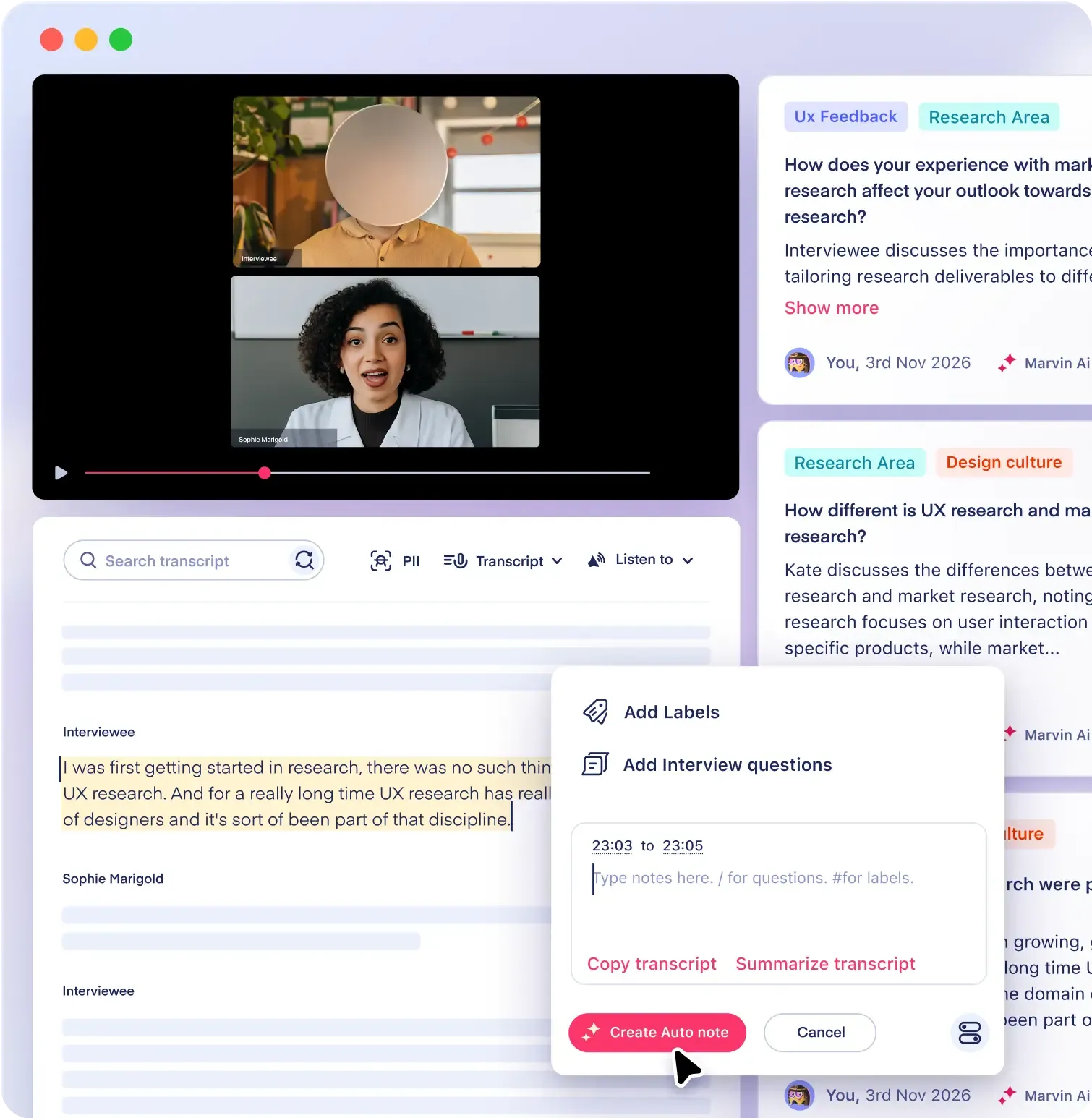 Automatically bring all your data into one centralized, searchable hub. Marvin keeps it organized, transcribed, and ready for analysis.